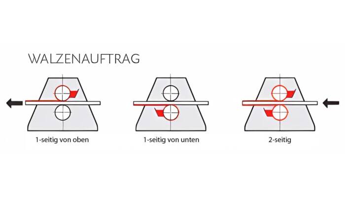 Die Maschine besteht aus einer Gegendruckwalze, einer Auftragswalze und einer Dosierwalze, die alle unabhängig voneinander gesteuert werden können.