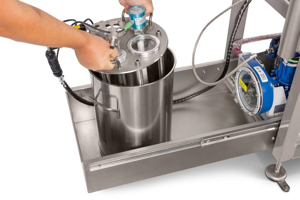 The roller coating machine comes as a complete assembly including pump, viscosity measurement and automatic re-thinning.